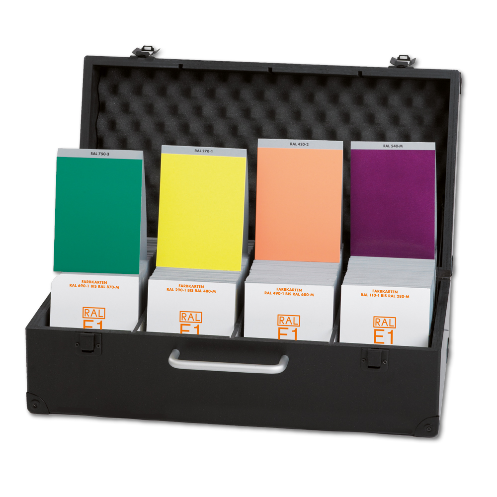 Farbregister-Basissammlung der RAL-EFFECT Farben als Einzelkarten (Uni-Farben semi-matt, Metallic-Farben in hochglänzend). 490 Karten, incl. Box