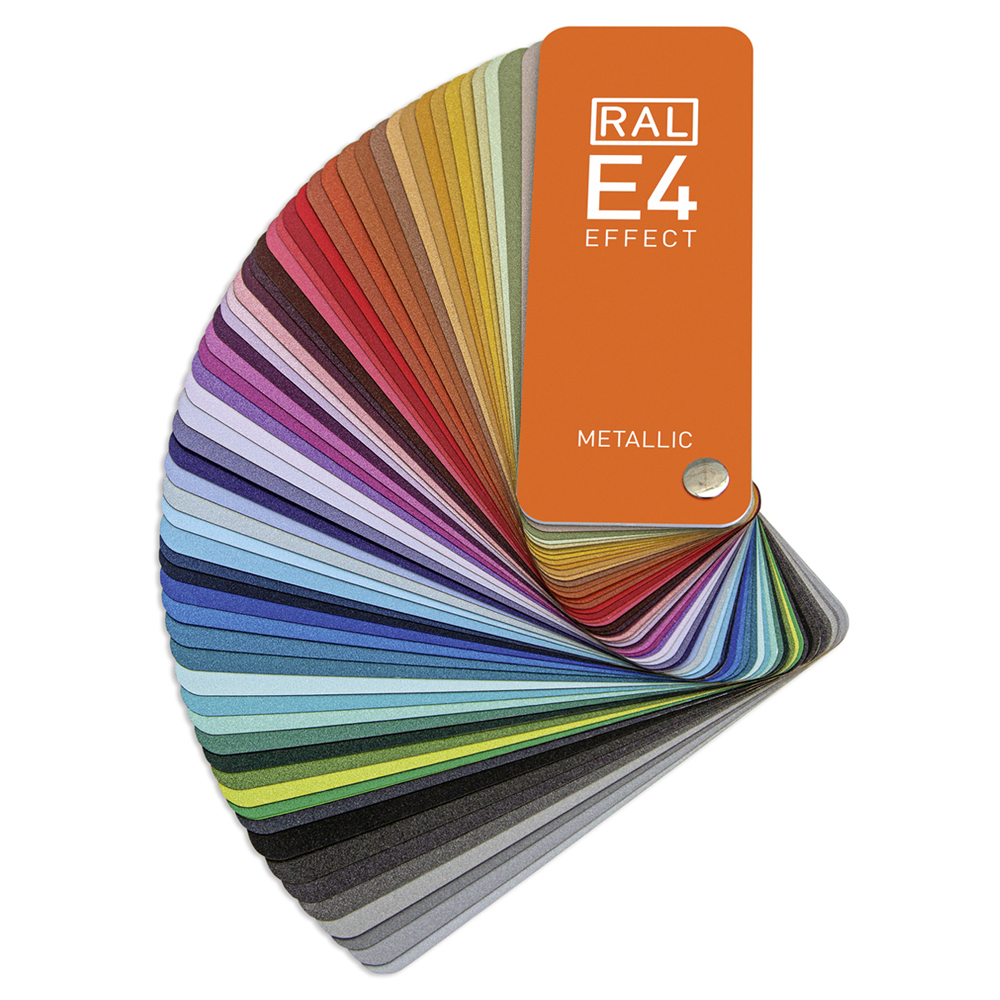 Farbfächer mit allen 70 RAL EFFECT Metallic-Farben. Größe der Metallic-Farbdarstellungen (vollflächig) und des Fächers 12,8 x 5,0cm.